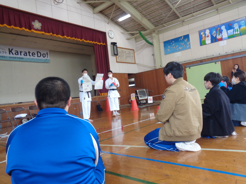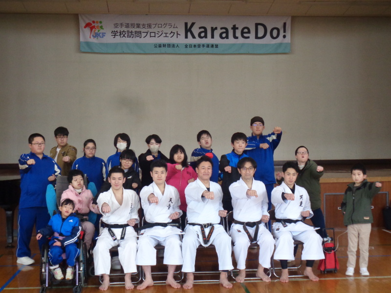 1月30日(金)、山形養護学校において空手道授業が行われました。指導は緑川寿幸副理事長、演武は武田輝琉愛氏、新関梗真氏、山口竜斗氏が担当しました。学校訪問プロジェクトKarateDo!(公財)全日本空手道連盟より依頼を受け中等部、高等部を対象に行いました。 報告書